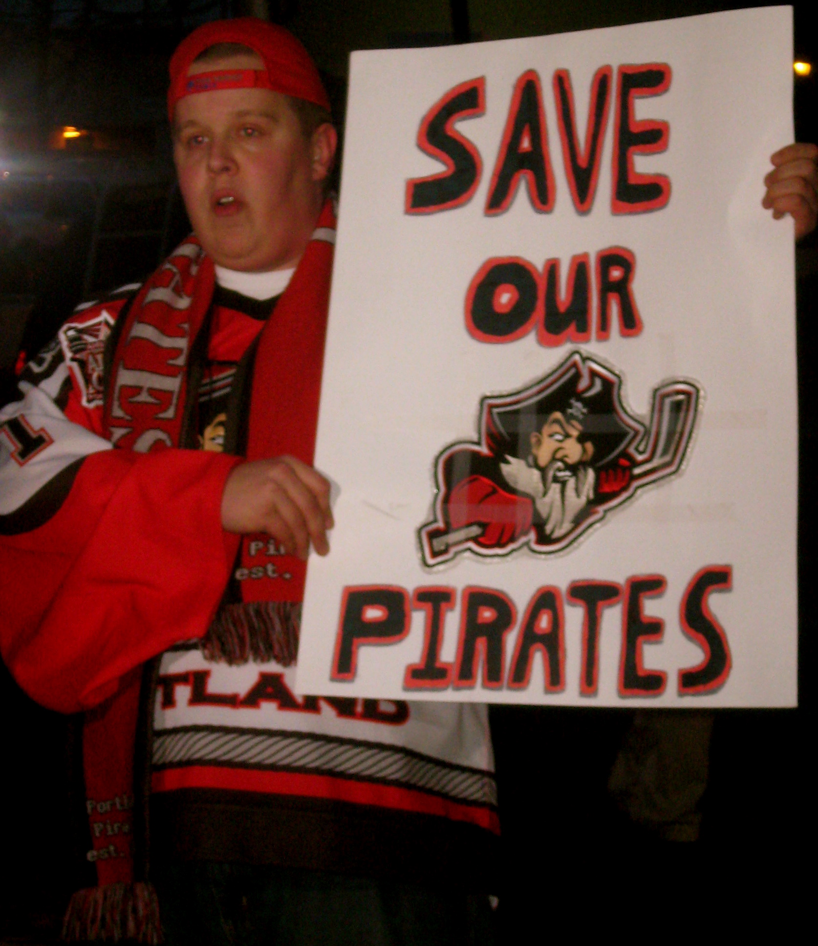 Outside the civic center on February 23, Andrew rallied his gang of buccaneers. In cold, misty air they carried signs pleading: “Save Our Pirates.”